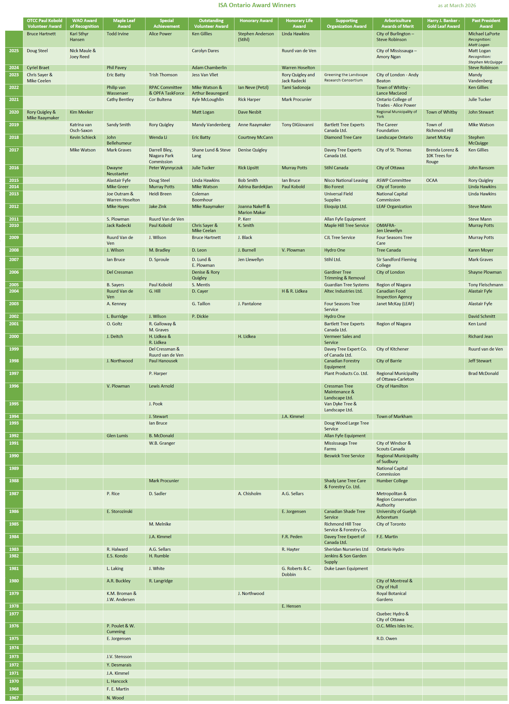 Awards play a significant role in the way the ISA Ontario recognizes individuals and organizations that are making significant contributions to the Arboriculture Industry here in Ontario.